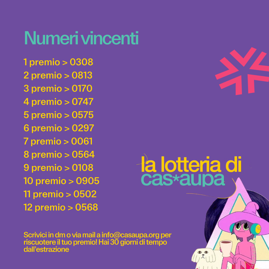 Hai vinto? Scrivici in dm o via mail a info@casaupa.org se sei il/la fortunat* che deve riscuotere un premio. Hai tempo fino a 30 giorni dall’estrazione ✨
