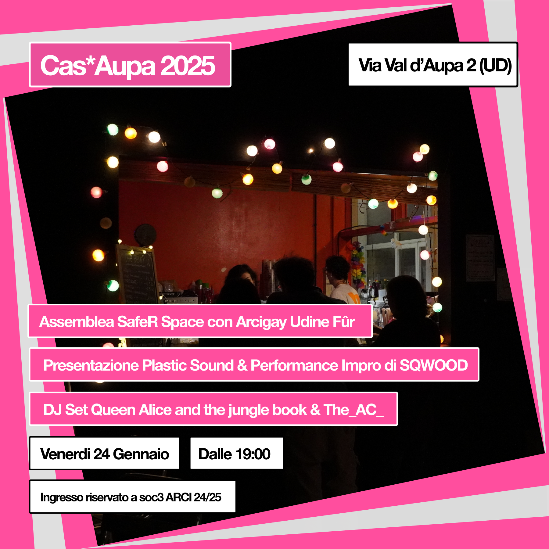 Aperta a tutt3 l3 soc3: sarà un momento di confronto ed ascolto, in cui ci sarà spazio per fare proposte sulle buone pratiche da rispettare a Cas*aupa. Con @arcigayudine.fur stileremo la bozza del protocollo che metteremo in atto per rendere il Circolo più sicuro e inclusivo per tutt3.