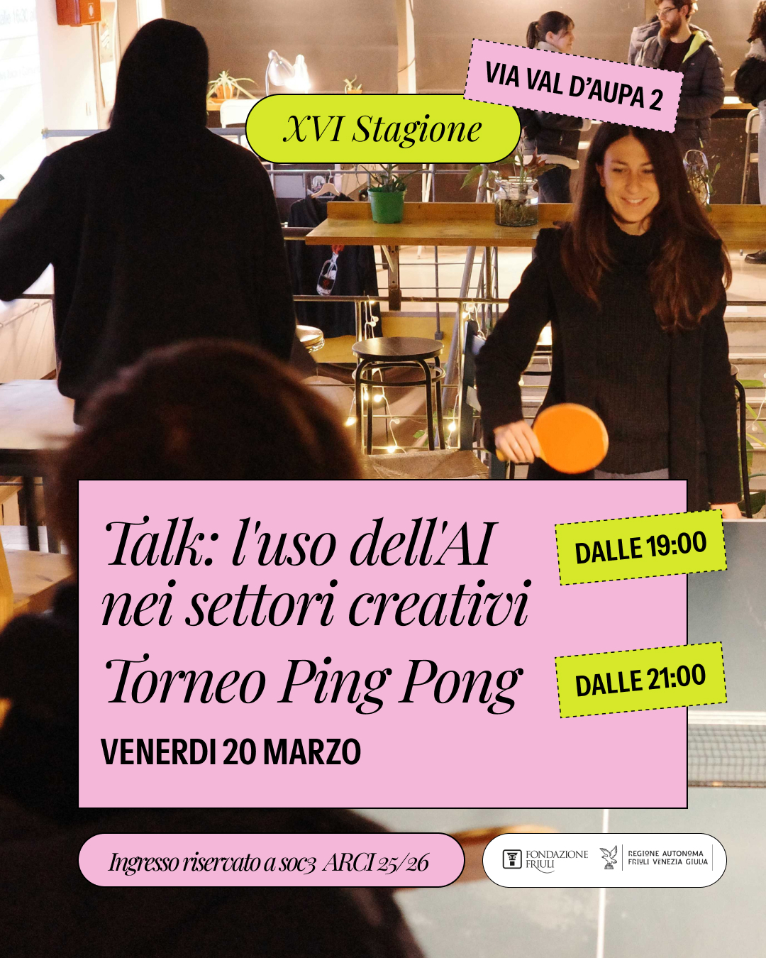 VenerdΓ¬ 20 marzo | Talk: L’uso dell’AI nei settori creativi | Torneo di pingpong π
