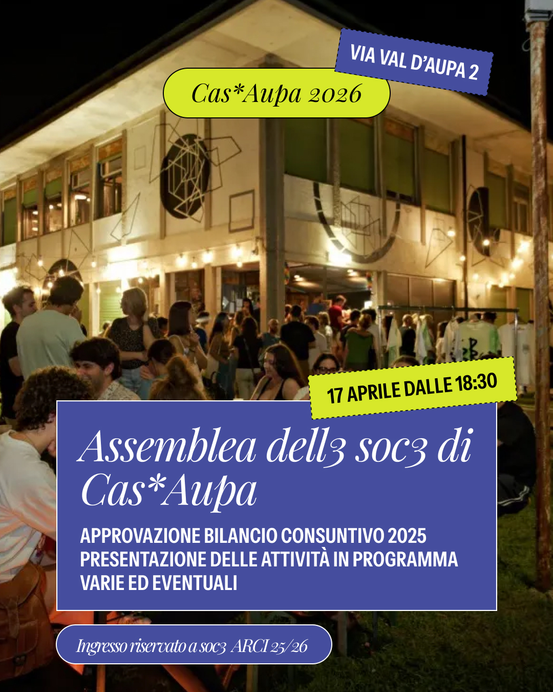 È convocata l’assemblea dell3 soc3 del Circolo Cas*Aupa APS – presso Via Val d’Aupa 2, Udine
